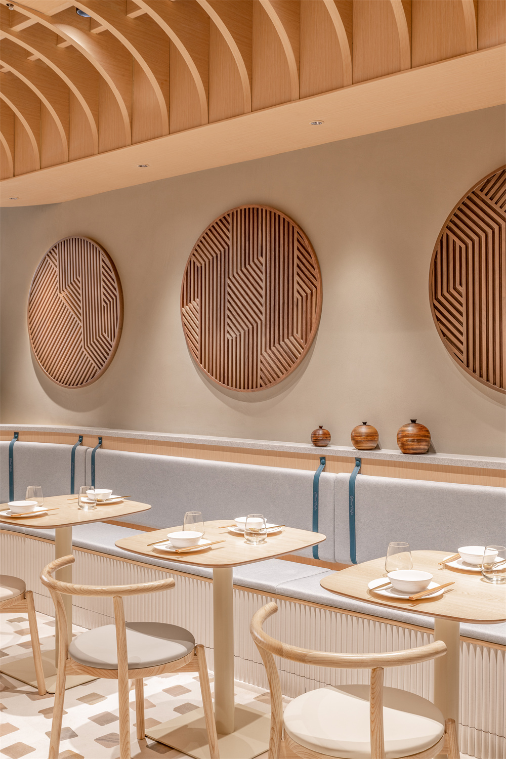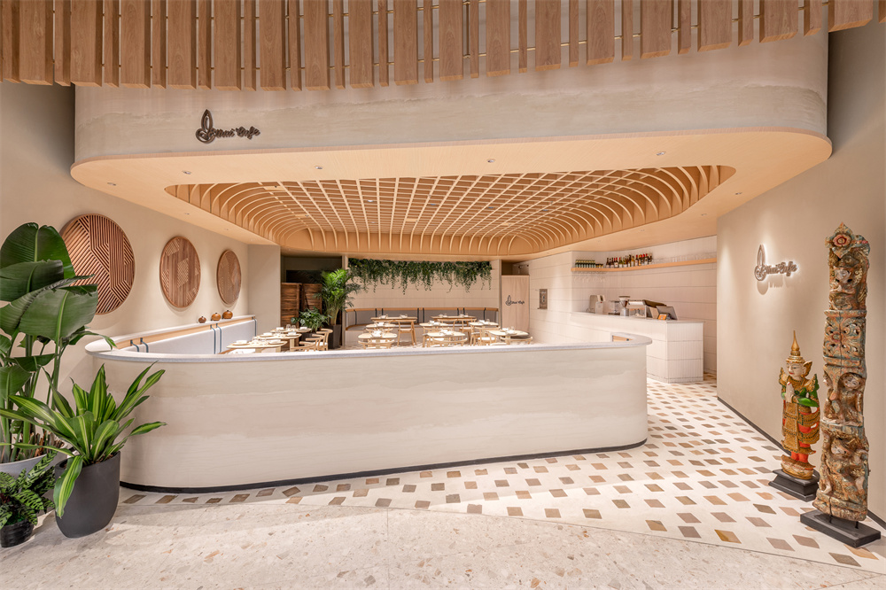 隐藏在上海嘉里中心繁忙的地下商场里,Ethai Café对传统泰国菜做了一种全新诠释,专注于用健康食材制作简单清淡的菜肴。朴素的色彩和材料调色板的渐变是基于泰国中部的考古遗址和土地的回想。同样地,EthaiCafé似乎是由包裹着外墙的夯土雕刻而成的。