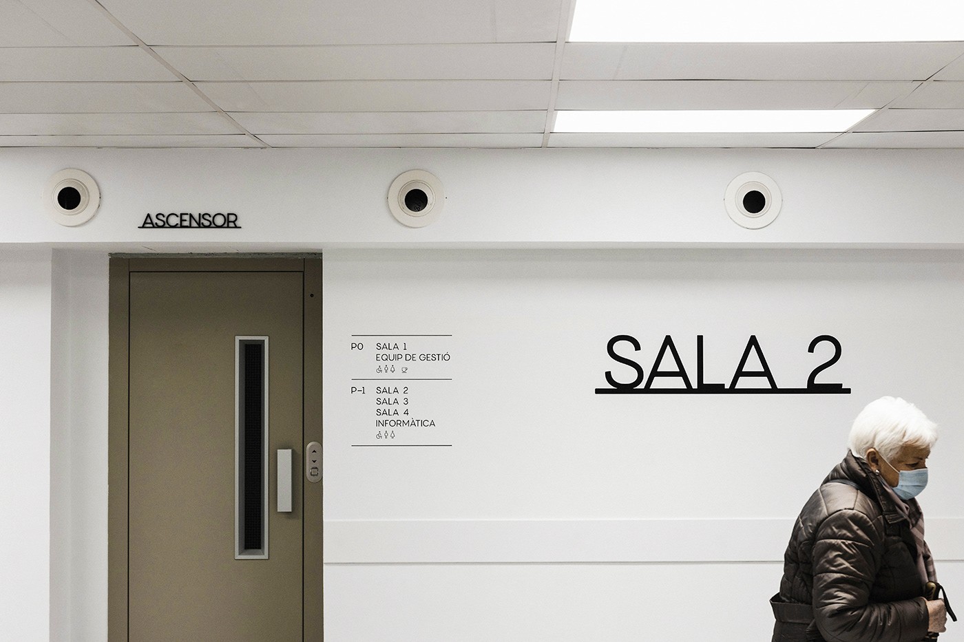 Penitents老年活动中心位于西班牙巴塞罗那市,设有学习室和活动室,旨在促进老年人的人际关系。基于Penitents老年活动中心的访客主体以老年人为主,采用巨大的信息标识,便于人们快速辨认和定位。简约的无衬线字体搭配下划线设计,提高了信息传达度,整套导视系统打造了友好的寻路体验。