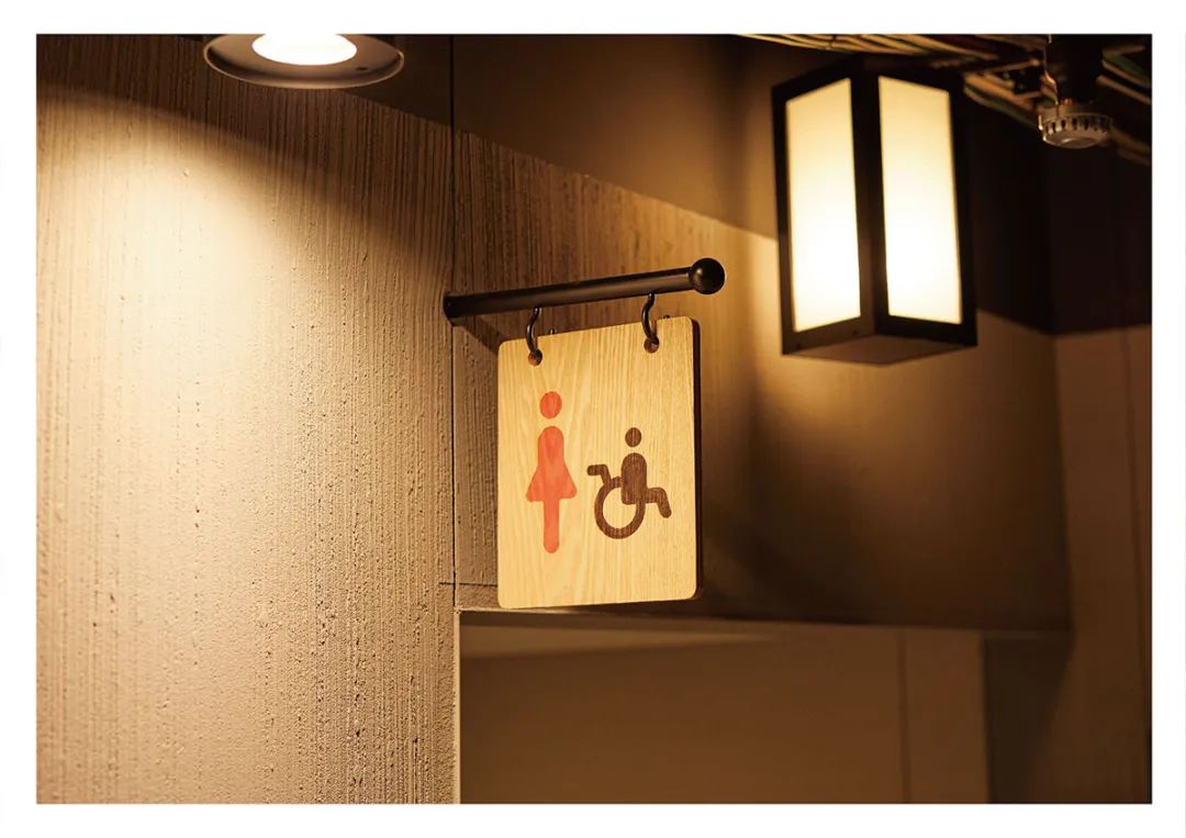 将“灯笼”、“木牌”、“和纸”、“行灯”等现代风格的主题设计成符合京都风情的标识。外部结构是灯笼,像木牌一样用挂钩安装的引导板,和纸弯曲垂下的形状中放入光模仿行灯的引导标志。我认为这些成为了让新建筑仿佛从很久以前就在那里一样让人感到怀念的标识计划。