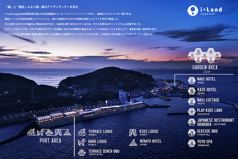 i + Land长崎酒店位于日本长崎县饭岛市,是公私合营的娱乐胜地,并且是岛屿再生项目的一部分。大西亮受邀为其进行导视系统设计。
