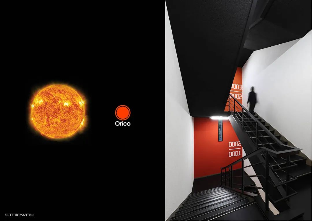 为了能在整个空间感受到奥利科的身份,以标志的由来“漆黑的宇宙黑色”和“精力充沛的太阳橙色”为基调展开导视设计,灵感来自公司的信用卡,在住宿室和共用部使用严格规定的信用卡的圆角方形和国际规格字体(Farrington7B),是以卡片为主题的空间设计。通过设计的力量稍微缓和新员工研修等逗留型研修的紧张感,同时通过员工共享奥利科的认同感,一边提高归属意识一边做出贡献。