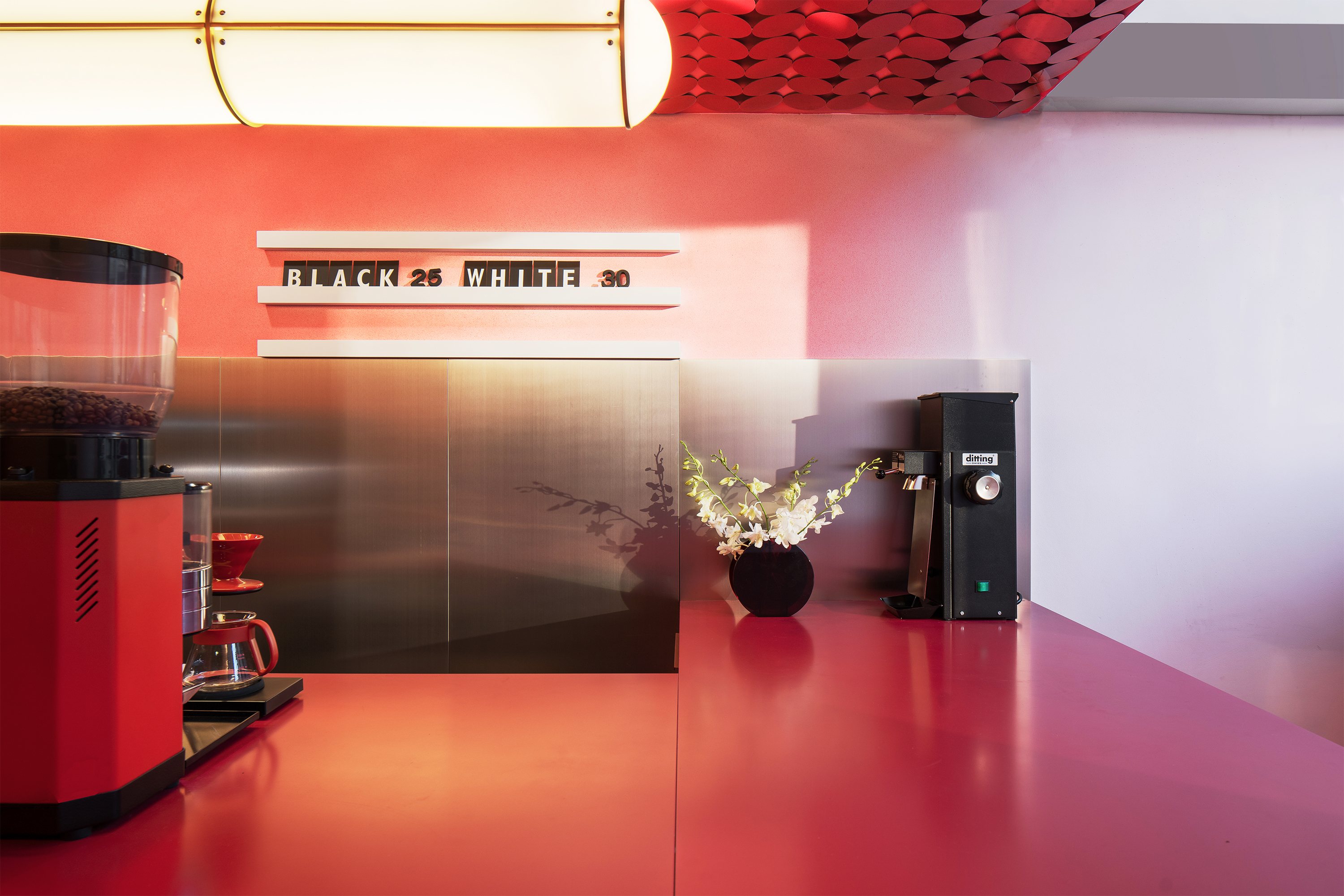 店内借着原有房屋结构,分为上下两层。从底层进入,墙面颜色由入口处的白色一路延伸,过渡到尽端的深红。由最深处的深红,到最外侧的纯白,这个过程好像不断的把阳光揉进来,让红色不至于太过厚重甚至沸腾。红色的基因还以交错的鳞片形式延续到了天花板,交错折叠的红色镜面金属圆片打破了屋顶原本的沉闷和压抑。台面上的操作、灯光、走动的顾客都被倒影在其中。锦莳设计把这一系列的红色组合在一起,构成一幅欢愉饱满而绝不冷淡的画面。看过电影《海鸥食堂》的人会知道,想要把咖啡煮好喝是需要一个咒语的。轻松的状态和爽朗的笑声,这些也许就是105 Café独有的魔咒。