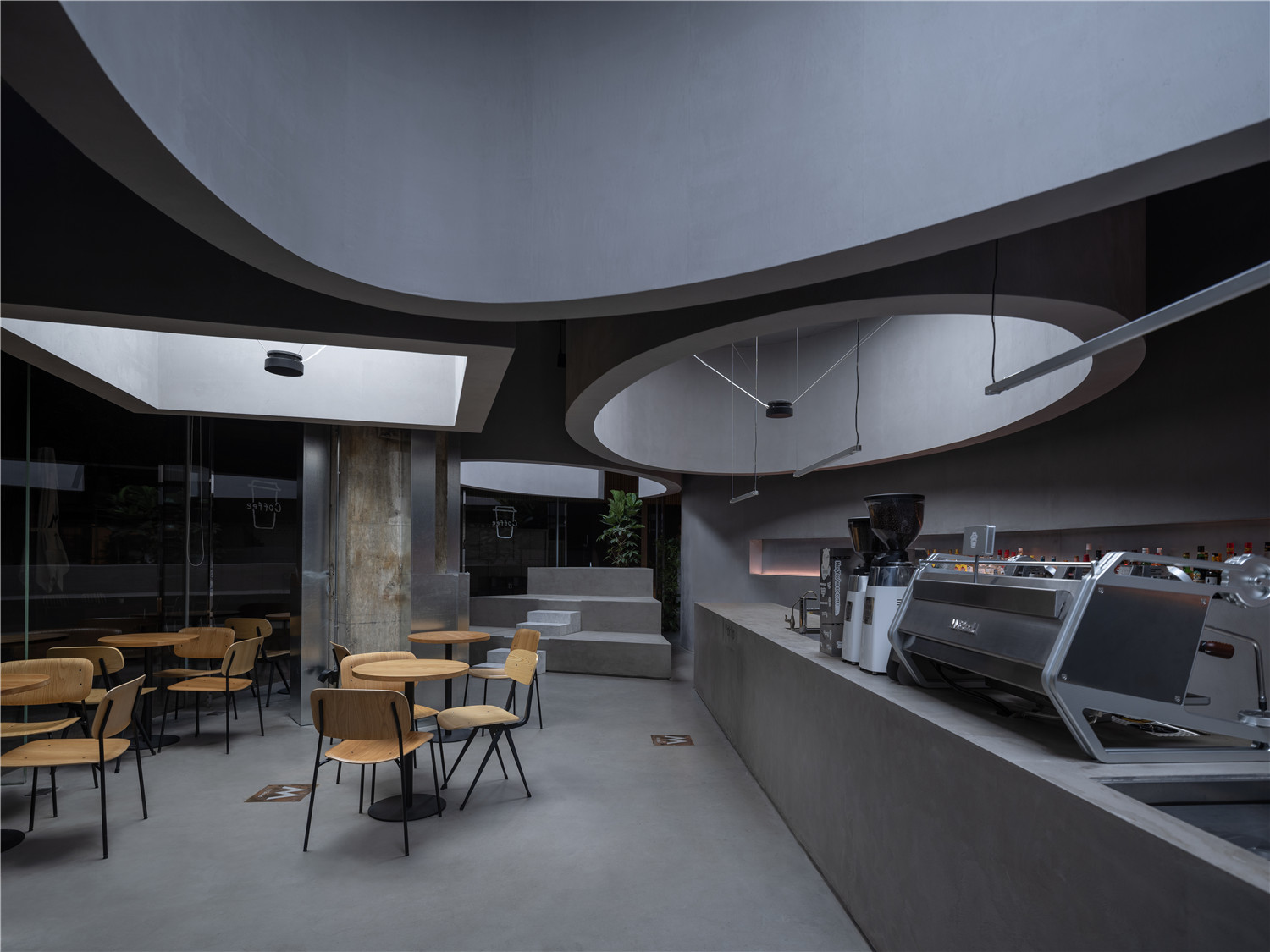 吧台、台阶、固定座椅等以几何的形式搁置在地面,并分别与上层结构发生关系,看似随机的平面暗含对位关系,试图在不规则中寻找某种秩序。