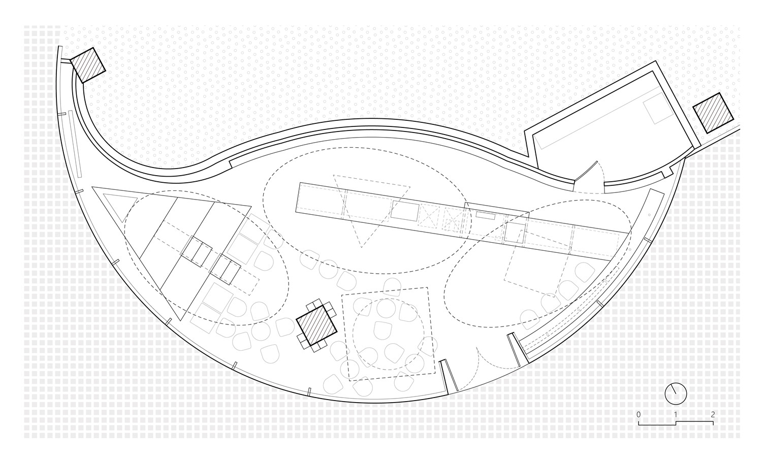 不规则的平面不准许平面上有过多的划分。设计师希望均质的空间在体验上富有变化,设计了四个“筒”状结构从顶上罩下,仿佛四个不同的房间。从室外看,内部的空间被包裹着光线的筒状结构充满,暗示人们一探究竟。而进入内部,筒内宽敞明亮,笼罩着前来休憩的人们。