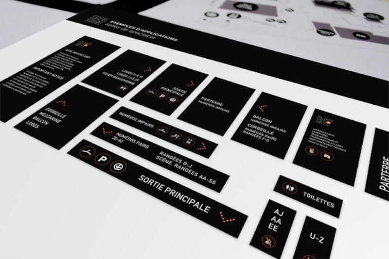 基于对lace des Arts剧院建筑环境的分析和研究,Audrey Saint-Cierge通过品牌标识开发了图形语言,采用橙色、黑色与白色的配色,重要信息使用橙色