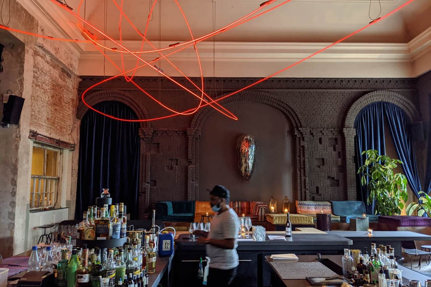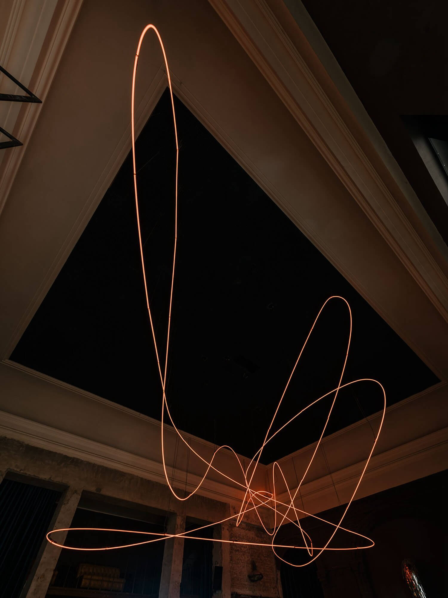 悬挂在中间开放式厨房和酒吧上方的霓虹灯装置来自瑞士艺术家Kerim Seiler,名为《Spaceknot》,长达100多米的红色霓虹灯管在空中缠绕出抽象的形状,探索了物质和精神之间的关系。