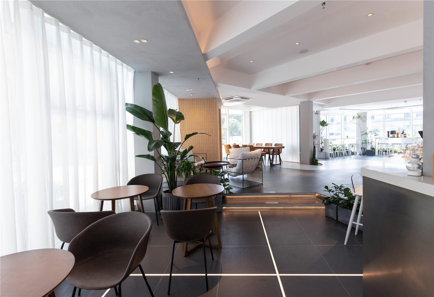 入口处理为繁华又落寞的老城区街道增加了一处转角的风景,仿佛置身于盗梦的城市空间,混乱又欣喜,入口的U玻加上绿植的处理,让景观和光线引入室内,一面纯粹的墙面就像推翻红砖墙而重新开始城市机理