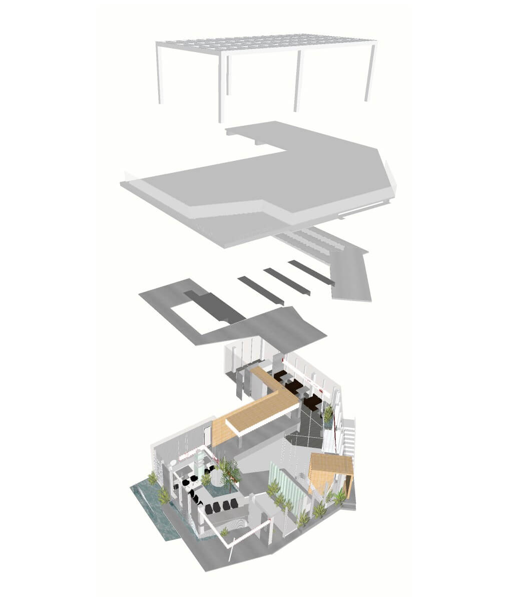 高低变化的层次和置入的不同体块组成完整的空间体系,从入口灰空间的引导到室内空间的变化,多维度的丰富内部体验