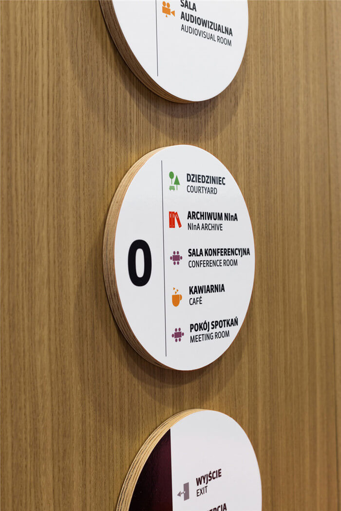 UVMW设计公司为波兰nina品牌总部提供全新的标识系统设计。特色标识设计涉及技术层、办公区域、摄影室以及休息区等的空间标牌打造。标识的材料以圆形复合板为基础,字体和图形符号清晰,形成一个醒目而又独特的导视引导工具,打造出一个和谐的视觉统一效果。