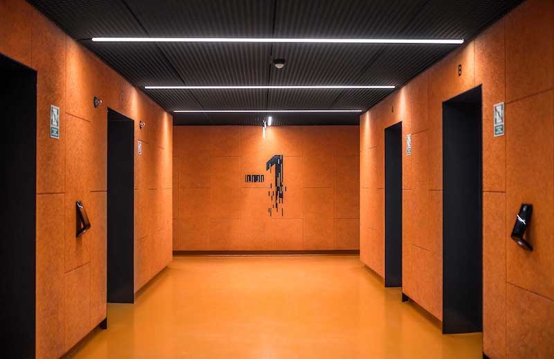 基于Cu办公室的建筑外观,kolektyf提取了其配色和不规则的竖条纹,应用于环境图形和字体设计中,巨大的数字编码搭配不规则竖条纹,标牌形状设计成长方形并加入竖条纹元素作为点缀。