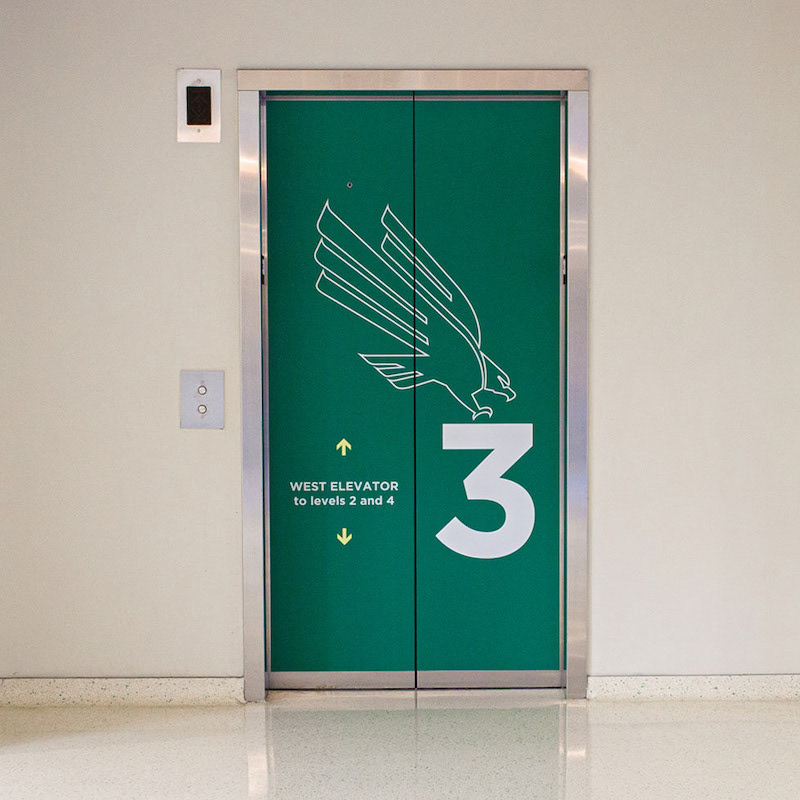 北德克萨斯大学位于美国德克萨斯州北部登顿市,其大学联盟是一个多层设施,提供完善的服务和设施,旨在增强教育体验、建立一个包容性的环境。Sharon Mathew受邀为其进行导视系统设计。基于大学联盟复杂的空间结构,Sharon Mathew采用大学联盟的品牌绿色作为导视系统的主要配色,在楼梯处和出入口利用柱子和墙面设计了覆盖式标牌,大面积的色块有助于营造空间的整体感。巨大的楼梯间标识和卫生间icon便于轻松寻路,整套导视系统营造了友好的环境。