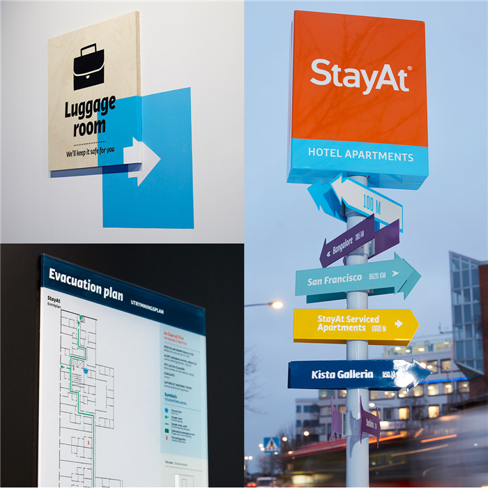StayAt是瑞典领先的连锁公寓酒店。为了保持品牌特性与建筑的协调,他们每开一家新的酒店,就需要一套新的导向系统和环境图形设计。