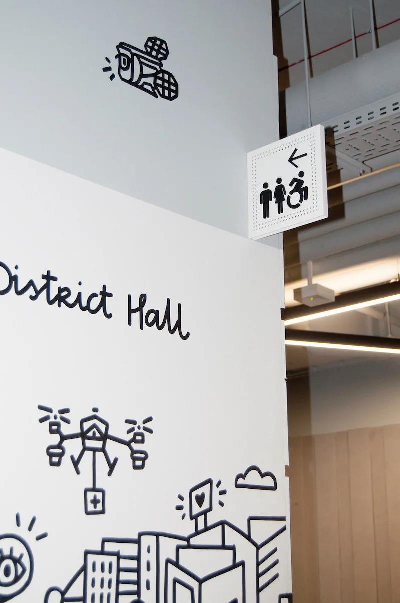 剑桥创新中心位于波兰华沙VARSO PLACE综合大楼内,占地面积约8,000平方米。拥有办公室、会议室、健身区、游戏室和联合办公场所等设施。Advertis采用黑白配色,白色波点穿孔背板搭配黑色信息指示,信息可读性高。在休闲区设计了活泼的环境图形,针对各种类型的办公室设计了巨大的icon,并应用于会议室玻璃上,整套导视清晰而具有特色。